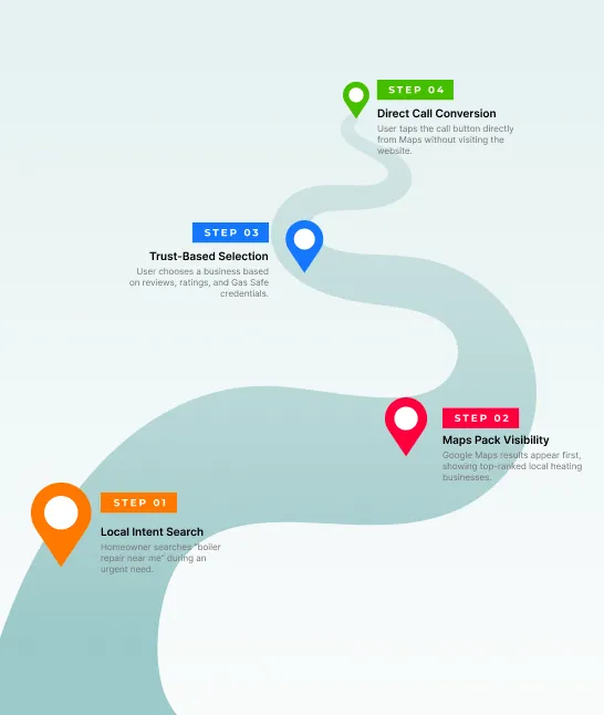 A homeowner searches ‘boiler repair [their town]’ on their phone on a cold morning. The first thing they see is the Maps pack. They tap the heating company with the most recent five-star reviews, see the Gas Safe badge listed, check the service area, and tap the call button. They never visit the website. They call directly from the Maps result.